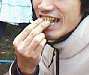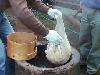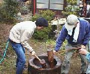 #5:1つ前の行程での練りの作業直前、もち米が潰れるか潰れないかという辺りでパクッと頬張る。この状態の時に食べるのが良い。非常においしいのだ。手作りの良い所。 | #6:練りが終わると今度は2人で交互にペッタンペッタンとついていく。このつきで完全にモチらしくなってくる。ある程度つくと今度は1人でつく。ウスの傍らにはサポートが付き、モチをつく度にモチをかえしていく。このカエシもかなりコツがいる。ツク人とカエス人のコンビネーションも大切。それが終わると単独で連続的についてモチの出来あがり。この最後のつきはシメと呼ばれる。 |