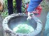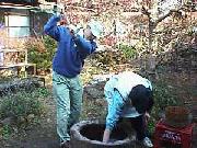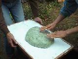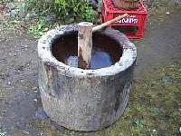 #7:つき終わったモチは直ぐに粉の敷かれた板に移され、その上で平らに伸ばされる。伸ばされたモチは次の日までに固まり食べ易い大きさ(一般的な長方形)に切られる。一部はお正月のお供え用や、その場でアンコを中につめてオマンジュウを作ったり、大根下ろしやきな粉とからめて食べるために丸くちぎられたりもする。 | #8:モチツキセット。おそらくこんなに大きなウスにはお目にかかれないだろう。しかもかなり年季が入っている。おじいちゃんが物心ついた時には既に存在していたらしい。 |